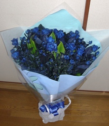 そして、今日が退職の日で、朝礼で、青いバラの花束をいただきました。